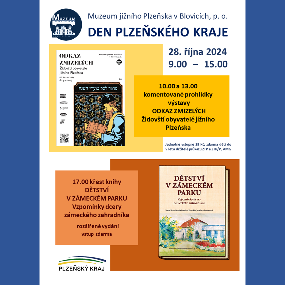 Den české státnosti slavíme tradičně jako Den krajů. Můžete se těšit na komentované prohlídky výstavy Odkaz zmizelých: Židovští obyvatelé jižního Plzeňska (10.00/13.00) a křest nového rozšířeného vydání knihy vzpomínek dcery zámeckého zahradníka Dětství v zámeckém parku (17.00).
