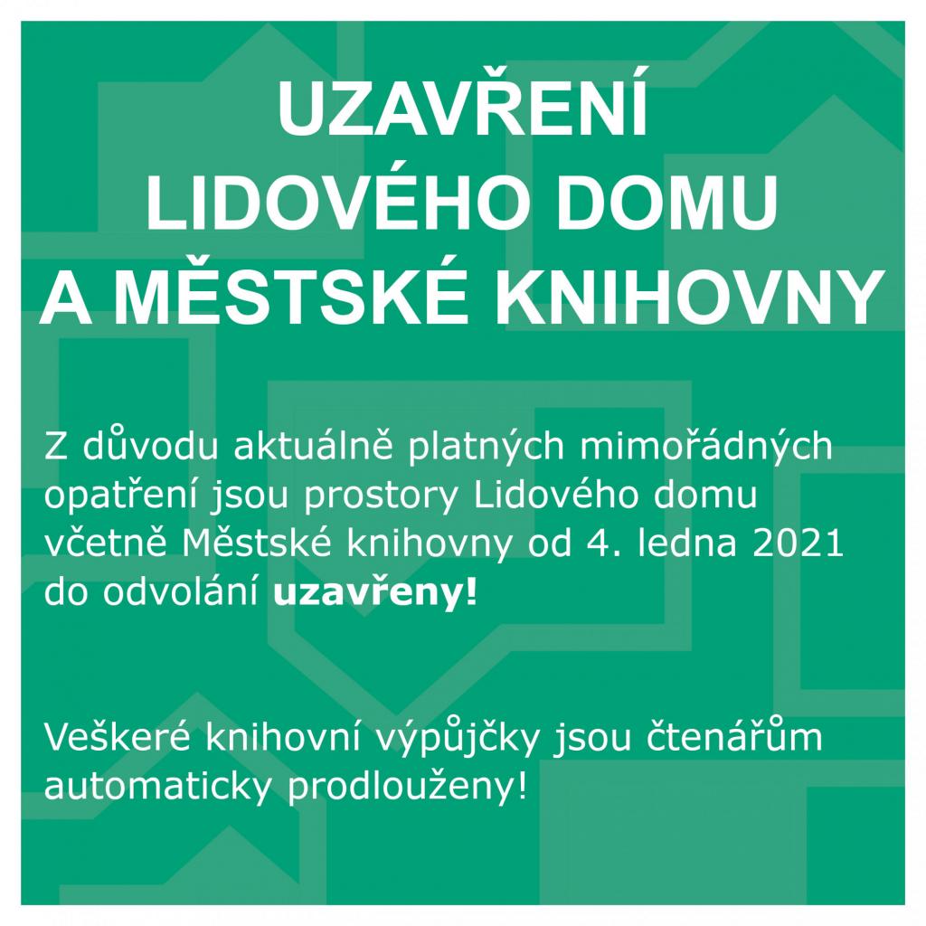 Z důvodu aktuálně platných mimořádných opatření jsou prostory Lidového domu včetně Městské knihovny od 4. ledna 2021 do odvolání uzavřeny! Veškeré knihovní výpůjčky jsou čtenářům automaticky prodlouženy!