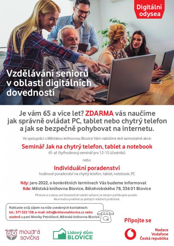 Projekt Digitální odysey má za cíl formou seminářů, kurzů, individuální pomoci seniory naučit správně a bezpečně ovládat chytré telefony, tablety, počítače a notebooky. Účastníci akcí mohou být jak úplní začátečníci, tak i pokročilí. Zúčastnit se mohou senioři od 65 let. Vzdělávání nabízíme ve dvou formách a to jako:
